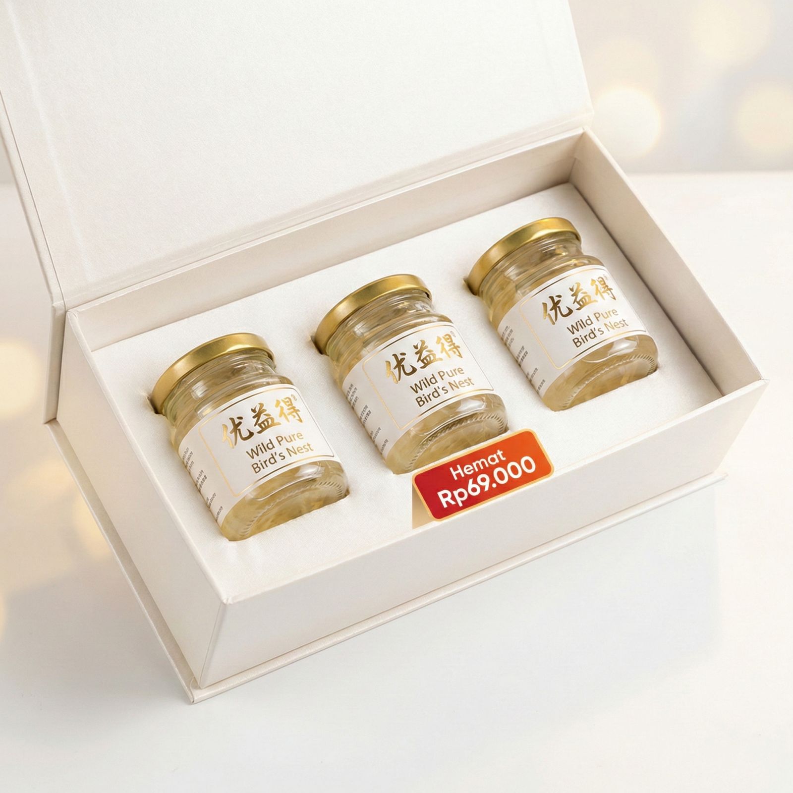 Dapatkan penghematan Rp 69.000 dengan Paket Promo Kotak isi 3 botol You Yi De Wild Pure Bird’s Nest.
